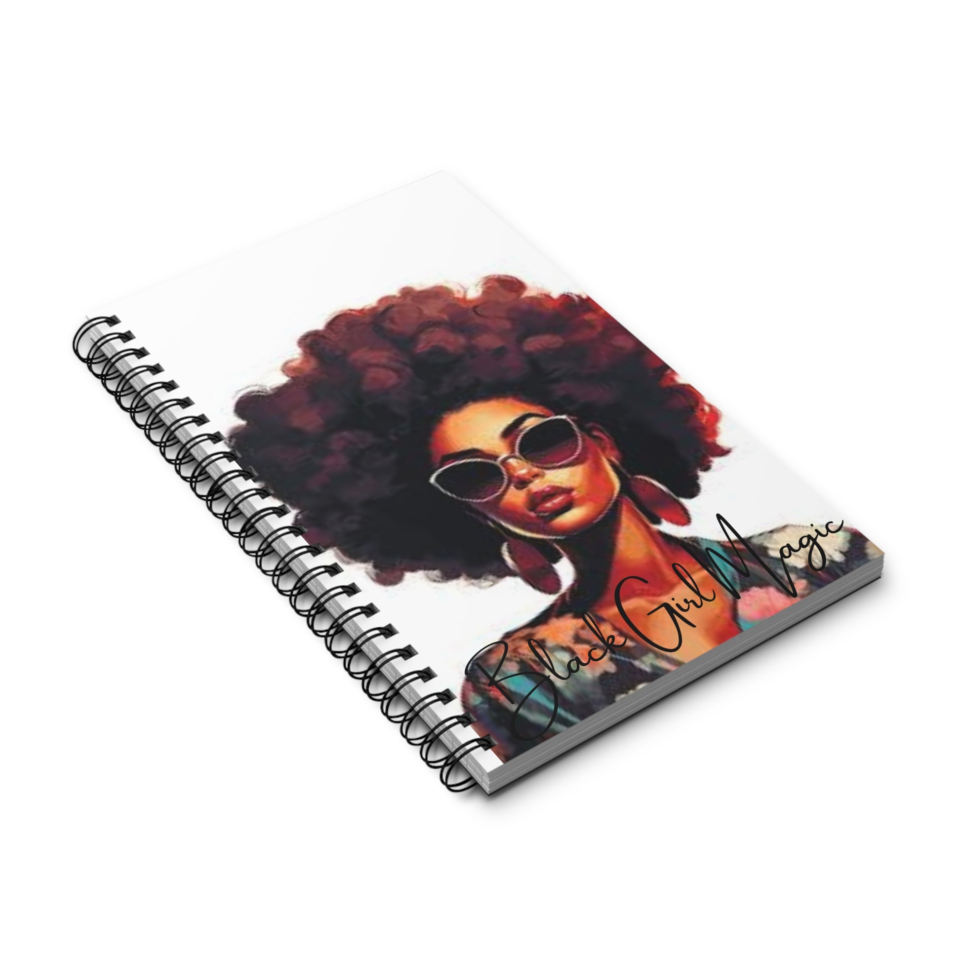 A black girl magic-themed journal perfect for writing. The semi gloss laminated cover provides durability and a smooth look. Vibrant colors bring out the bright and crisp designs. This journal is ideal for adults who appreciate unique and empowering artwork. Relevant for celebrations like Black History Month and Women's History Month.